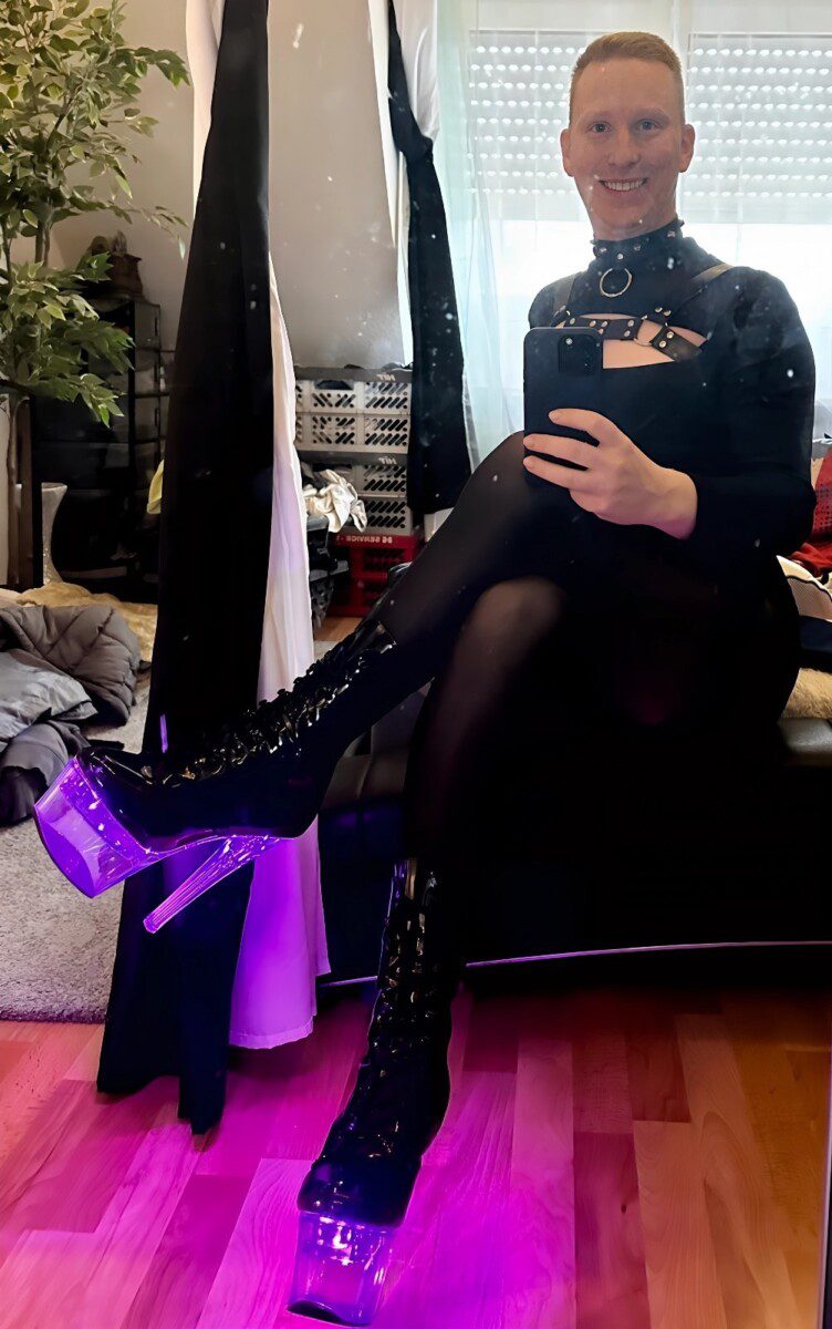 As you can tell from the photos, Marcel, enjoys wearing the finest in fashion. His wardrobe consists of men’s jean shorts and knee- boots that show exactly what has about. He completes his look with liberal applications of eyeliner, drawn on brows and bright red lip stick.. turning himself into the woman has always wanted to be, ready to take any he can get.